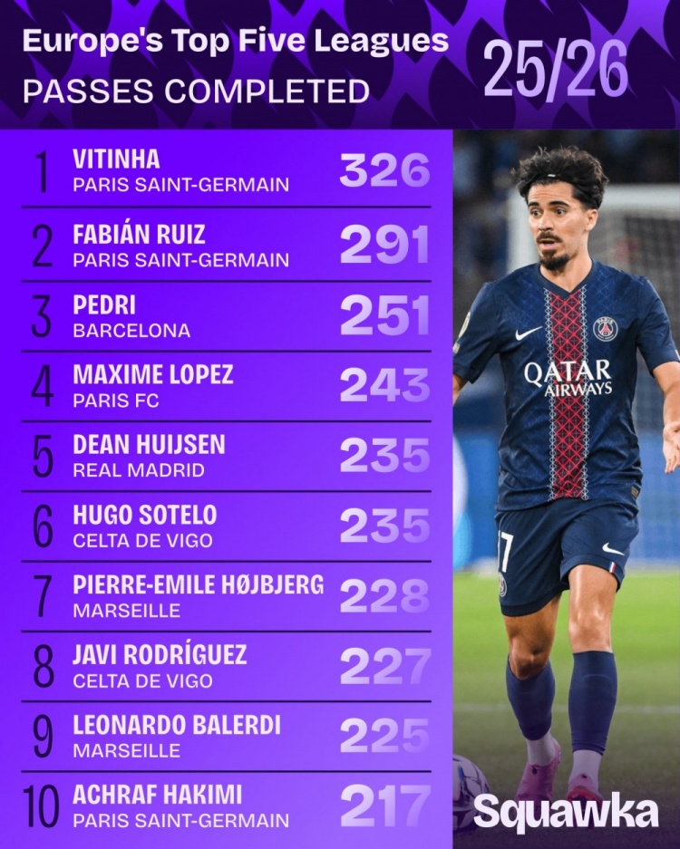 9月12日讯 Squawka统计了本赛季球员在五大联赛的成功传球次数,并列出榜单。本赛季五大联赛成功传球排名:维蒂尼亚(巴黎圣日耳曼)——326法比安-鲁伊斯(巴黎圣日耳曼)——291佩德里(巴塞罗那)——251马克西姆-洛佩斯(巴黎FC)——243赫伊森(皇家马德里)——235索特洛(塞尔塔)——235霍伊别尔(马赛)——228哈维-罗德里格斯(塞尔塔)—...